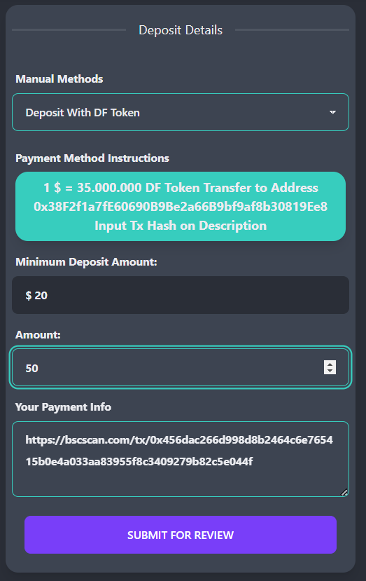<figure><img src="https://3090676682-files.gitbook.io/~/files/v0/b/gitbook-x-prod.appspot.com/o/spaces%2FL0wZUhy3Ouc3QlIEg7YJ%2Fuploads%2Fw4ZyjXG383oSTOVn6dBS%2Fdeposit.png?alt=media&#x26;token=a16fa10c-90ff-4cac-9626-8a70a0acd702" alt=""><figcaption><p>example deposit with DF</p></figcaption></figure>